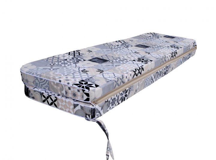 Данный матрас предназначен для садовой качели. Такие матрасы изготавливаются из универсальных тканей, изготовленных в Испании. Благодаря тому, что в такой ткани огромный процент натуральных волокон, она замечательно пропускает воздух, а также является максимально приятной на ощупь. Эта ткань устойчива к появлению пятен, она с лёгкостью разглаживается. Наполнитель изготовлен из пенополиуретана вторичного вспенивания. Спинка, а также сиденье матраса выполнены на молнии, поэтому наполнитель с лёгкостью можно вынуть, а чехол легко можно постирать. Для того, чтобы матрас надёжно держался на качели, на нём есть специальные завязки по бокам.